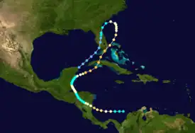 This hurricane originated on October 4 near Barbados as a "cyclonic perturbation"; however, no closed circulation was evidently associated with the system. Barometric pressures began sinking in Panama as the system drifted westward,[15] and it was considered a tropical storm by October 8. As the storm headed west, it rapidly strengthened; the storm became a hurricane on October 9 and intensified into a major hurricane on October 10. As it began to curve northwestward, the hurricane made landfall in Nicaragua, and weakened to a tropical storm on October 11. It began to drift north-northwestward later that day, intensifying into a minimal hurricane as it drifted into the Gulf of Honduras.[2]