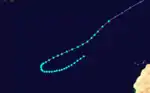 This tropical storm was previously unidentified and was not considered a tropical storm until research by José Fernández-Partagás in 1997.[15] The storm is believed to have originated west of the Canary Islands in the northeastern Atlantic on September 22. The tropical storm moved west-southwestward for several days, maintaining its peak winds of 70 mph (115 km/h); however, the storm began to curve early on September 26 and traveled directly westward before curving northward during the afternoon. The tropical storm continued to change course, turning west-northwestward by September 28. The transitioned to an extratropical system on October 1,[2] and reached England on October 3.[15]