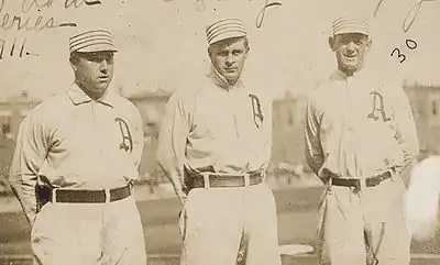 Starting in 1911, the team was known for its "$100,000 infield", consisting of John "Stuffy" McInnis (first base), Eddie Collins (second base), Jack Barry (shortstop), and Frank "Home Run" Baker (third base) as well as pitchers Eddie Plank and Charles "Chief" Bender.[1]