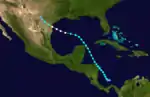 Weather maps and ship data indicate the development of a tropical depression in the southwestern Caribbean Sea around 06:00 UTC on June 21.[3] Moving north-northwestward, the depression accelerated and intensified into a tropical storm on the following day. Early on June 23, the storm made landfall near the Honduras–Nicaragua border with winds of 40 mph (64 km/h). Thereafter, it continued north-northwestward and oscillated slightly in strength. The system made another landfall near Cancún, Quintana Roo, with winds of 45 mph (72 km/h) late on June 25. After briefly crossing the Yucatan Peninsula, the cyclone emerged into the Gulf of Mexico and eventually began moving more to the west-northwest. Early on June 27, it deepened into a Category 1 hurricane and peaked with maximum sustained winds of 75 mph (121 km/h). The hurricane then curved northwestward and made landfall in Padre Island, Texas, at the same intensity around 01:00 UTC on June 28. After moving inland, the storm quickly weakened and dissipated over Val Verde County just under 24 hours later.[4]