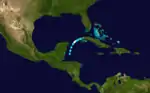 The final tropical storm developed in the northwestern Caribbean Sea about 60 mi (97 km) southeast of Banco Chinchorro, Mexico, at 00:00 UTC on October 28. Moving north-northeast, the storm reached Category 1 hurricane intensity about 24 hours after its classification. Around that time, it peaked with maximum sustained winds of 75 mph (121 km/h). Around 06:00 UTC on October 29, the system made landfall near Cape San Antonio, Cuba, at the same intensity. After about six hours over Cuba, the hurricane weakened to a tropical storm.[4] It transitioned into an extratropical cyclone in present-day Mayabeque Province before being absorbed by a frontal boundary shortly thereafter.[3][4]