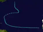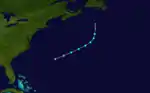 Weather maps and ship data indicated a tropical depression formed near the west coast of Africa on August 26.[3] Early the next day, the system strengthened into a tropical storm. It then tracked westward for several days, threatening the Lesser Antilles before turning north-northwestward on September 3. Eventually, the storm recurved to the northeast before beginning an eastward direction on September 7. The following morning, it peaked with maximum sustained winds of 70 mph (110 km/h) – just shy of hurricane status. Thereafter, the cyclone moved northward to northwestward for the next few days. Around 12:00 UTC on September 12, the storm became extratropical while located about 290 mi (470 km) southeast of Cape Race, Newfoundland and Labrador.[4]