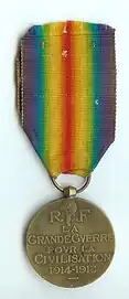 The 1914–1918 Inter-Allied Victory medal (French: "Médaille Interalliée de la Victoire 1914–1918") was a French commemorative medal established on 20 July 1922. It was the French version of a common allied campaign medal where each allied nation issued a Victory Medal to their own nationals, all issues having certain common features, including the same ribbon, a winged figure of victory on the obverse and a similar inscription on the reverse, the French version reading "LA GRANDE GVERRE POUR LA CIVILISATION 1914-1918".