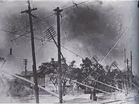 Upon making landfall, onshore anemometers documented winds stronger than had been recorded in any previous hurricane along the United States Gulf Coast. Gusts as high as 130 mph (210 km/h) were reported in New Orleans, with five-minute sustained winds peaking at 86 mph (138 km/h).[13] In Burrwood, Louisiana, a Weather Bureau anemometer documented peak five-minute sustained windspeeds of 122 mph (196 km/h), though when the abnormally high bias of the era's anemometers and adjustment to the more standard one-minute sustained measure are accounted for, this yields a speed of 99 mph (159 km/h).[1] The intense winds caused extensive damage across New Orleans, where nearly every building sustained damage.[13] The French Market was partly demolished, while the roof of a prominent Masonic temple partially collapsed.[15] Combined with powerful waves, the winds resulted in the sinking of four small steamers at the Port of New Orleans, in addition to several coal barges. A number of other steamers and small craft were blown from bayous and bays onto dry land.[13] The winds also caused widespread power outages, cutting telecommunications to and from the city,[16] and putting over 8000 telephones out of commission. Electric lighting was also disabled by the storm following the failure of city's power station.[15] Damage to city-owned property in New Orleans was appraised at nearly US$500,000, though the total amount of damage to all public and private property in the city was estimated to have been at least ten times greater at US$5 million. Damage to shipping along the Mississippi River in and around New Orleans was estimated at US$1.75 million.[13] Following the storm's passage, rail service to New Orleans was suspended.[15]