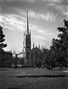 Roofs were blown off buildings and the Presbytère on Jackson Square lost its cupola. The clock on St. Louis Cathedral stopped at 5:50pm, the height of the storm. The hurricane damaged the Times-Picayune building, hampering newspaper production. More church steeples in the city were blown down or significantly damaged than remained intact.[17]