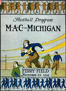 On November 23, 1918, the Aggies played Michigan at Ferry Field in front of the largest crowd of the season estimated at between 10,000 and 20,000. Followers of both schools attended in large numbers, "the maize and blue of Michigan and the green and white of M.A.C. decorating the stands the length and breadth of them."[4] The Aggies in 1918 had a new head coach, George Gauthier, and a highly touted African-American running back, Harry Graves. The Aggies had defeated Knute Rockne's Notre Dame the previous week in East Lansing.[4]