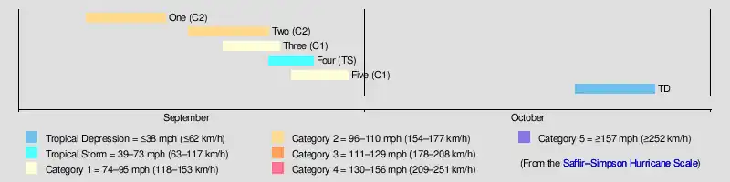 The season's activity was reflected with an accumulated cyclone energy (ACE) rating of 30,[2] below the 19111920 average of 58.7.[3] ACE is, broadly speaking, a measure of the power of the hurricane multiplied by the length of time it existed, so storms that last a long time, as well as particularly strong hurricanes, have high ACEs. It is only calculated for full advisories on tropical systems at or exceeding 39 mph (63 km/h), which is the threshold for tropical storm status.[2]