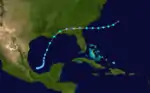 Considered a tropical storm until reanalysis in 2009, this tropical depression formed over the southwestern Caribbean around 00:00 UTC on October 15. The depression moved northwestward for about 24 hours, before decelerating and turning to the north. By October 17, the system began moving north-northeastward and passed near the Cayman Islands on the following day. The cyclone then struck Cuba on October 19 before emerging into the Atlantic. Early on October 20, the storm turned northward while situated just east of Andros Island and passed over or near several western Bahamian islands throughout the day. The system transitioned into an extratropical cyclone by 12:00 UTC on October 21 about 290 mi (465 km) east of Daytona Beach, Florida. However, the extratropical remnants intensified, reaching sustained winds of 85 mph (140 km/h) early on October 23 – equivalent to a Category 1 hurricane. Moving north-northwestward, the extratropical low struck Virginia near the southern end of the Delmarva Peninsula later that day. After entering Canada, the system curved east-northeastward over Quebec and crossed the Gulf of Saint Lawrence and Newfoundland before re-emerging into the Atlantic on October 26. The low was last recorded to the east-southeast of the southern tip of Greenland on October 29, though historic weather maps suggest that the system may have persisted until November 2.[4]