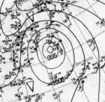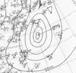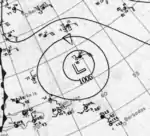 Around August 31, a low-pressure area formed along the tail end of a cold front extending from the Bahamas to Bermuda.[4] Early on the following day, a tropical depression developed roughly 510 mi (820 km) east-southeast of Jacksonville, Florida.[2] The depression moved slowly east-northeastward as the cold front dissipated.[4][2] Late on September 3, the system intensified into a tropical storm, and the next day the cyclone passed northwest of Bermuda.[2] Based on observations from the S.S. Evergreen City, the small storm likely reached Category 1 hurricane intensity early on September 5.[4] The cyclone continued to strengthen, reaching Category 2 intensity on September 6 while drifting northward and then peaking with maximum sustained winds of 105 mph (165 km/h) early the following day. On September 8, the system curved northwestward and weakened to a Category 1 hurricane. The storm then turned north-northeastward on September 9 and transitioned into an extratropical cyclone later that day. The extratropical low continued north-northeastward until dissipating over southern Newfoundland on September 10.[2] Cape Race observed sustained winds of 29 mph (47 km/h).[4]