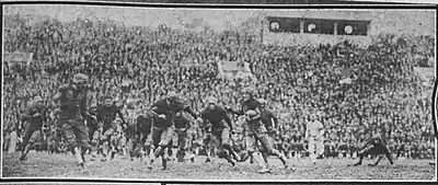 The starting lineup was Winslett (left end), Camp (left tackle), Jones (left guard), Holmes (center), Buckler (right guard), Perry (right tackle), T. Brown (right end), Hubert (quarterback), M. Brown (left halfback), Barnes (right halfback), Gillis (fullback).[41]