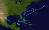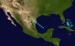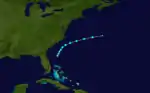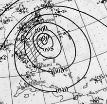 A tropical depression developed near the Yucatan Peninsula early on November 27.[6] The depression drifted southeastward and gradually strengthened into a tropical storm.[6] Once in the gulf, it accelerated and intensified to winds of 65 mph (105 km/h).[10] Early on December 1, the storm made landfall near Fort Myers, Florida, at the same intensity. The system weakened and soon became extratropical. The extratropical cyclone emerged over the eastern Atlantic several hours later and regained hurricane-force winds. By 0000 UTC, the extratropical system peaked with winds of 90 mph (140 km/h) and a minimum pressure of 980 mbar (29 inHg).[6] Around this time, the U. S. S. Patoka, which was in the vicinity of the storm, recorded a pressure of 978.5 mbar (28.90 inHg).[2] The northeastward movement slowed shortly after crossing Florida.[6] Around 2300 UTC, it made landfall between Wilmington and Cape Hatteras[2] with winds equivalent to a minimal hurricane. Shortly after landfall, maximum sustained winds in the storm dropped below 75 mph (121 km/h).[6] A strong area of high pressure located over the Canadian Maritimes caused the system to turn east-southeastward.[2] On December 5, the storm weakened further to the equivalent of a tropical depression as the system began to move towards the south.[6] The remnants of the storm continued eastward, passing several hundred miles north of Bermuda later that day. The cyclone was reported near the Azores on December 9, before finally merging with another cyclone over the North Atlantic.[2]