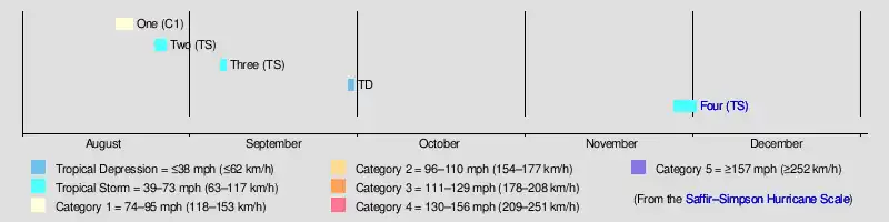 The season's activity was reflected with an accumulated cyclone energy (ACE) rating of 7,[3] one of the lowest totals ever and far below the 19211930 average of 76.6.[3][4] ACE is a metric used to express the energy used by a tropical cyclone during its lifetime. Therefore, a storm with a longer duration will have high values of ACE. It is only calculated at six-hour increments in which specific tropical and subtropical systems are either at or above sustained wind speeds of 39 mph (63 km/h), which is the threshold for tropical storm intensity. Thus, tropical depressions are not included here.[3]