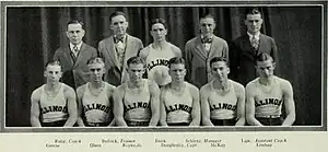 Craig Ruby entered his fifth season as head coach of the Fighting Illini. This team returned only five letterman from a team that placed in a tie for fifth place in the Big Ten a year earlier. Slightly improved, the team finished with an overall record of 10 wins and 7 losses. In the conference they finished with 7 wins and 5 losses. The starting lineup included captain Russell Daugherity at forward, Ernest Dorn and Robert Greene rotating at the other forward slot, Robert McKay and K.L. Reynolds at guard, and F.H. Lindsay at center.[2]