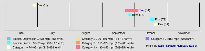 The second storm of the season originated from a tropical wave that developed in the vicinity of Cape Verde on September 11.[4] The wave became a tropical depression at 00:00 UTC on September 19, while located about 300 mi (480 km) north-northeast of Anegada in the British Virgin Islands. The depression drifted just north of due west while strengthening slowly, becoming a tropical storm early on September 22. Later that day, the storm curved northwestward. Around midday on September 23, it intensified into a hurricane. While turning southwestward on the following day, the hurricane began to undergo rapid deepening. Late on September 25, the system peaked with maximum sustained winds of 155 mph (250 km/h), an estimate based on pressure-wind relationship, with a minimum barometric pressure of 924 mbar (27.3 inHg).[5]