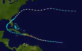 The mountainous terrain of Hispaniola rapidly weakened the system to a tropical storm early on September 4. Moving westward over the Caribbean Sea, the storm failed to re-strengthen before making landfall in western Cuba with winds of 40 mph (65 km/h) around midday on September 6. Thereafter, the system entered the Gulf of Mexico and curved northeastward. At 09:00 UTC on September 9, the storm again made landfall near Bradenton, Florida, with winds of 45 mph (75 km/h). Later that day, the storm weakened to a tropical depression while crossing Florida. Upon emerging into the Atlantic Ocean on the next day, the system re-intensified into a tropical storm. While located offshore South Carolina, the storm re-attained hurricane status early on September 12. The hurricane then brushed the Outer Banks of North Carolina before heading out to sea. The storm further strengthened to Category 2 intensity while heading eastward, but later weakened to a tropical storm early on September 16. The following day, the storm deteriorated further to a tropical depression, and late on September 17, the cyclone dissipated southwest of the Azores.[2]