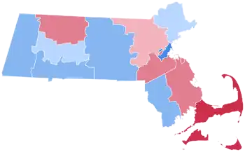 However, Massachusetts trended hard towards Hoover in 1932, giving Roosevelt only a four point win despite having voted for Smith four years earlier, displaying something of a 'snapback'[3] to its traditional New England Republican roots. As Roosevelt was re-elected nationally in a massive landslide, Massachusetts remained well to the right of the nation overall. Whereas pre-New Deal Republicans from south and west of the Hudson showed very little loyalty to their old party following the Depression, in New England, Republicans became galvanized to slow FDR's expansion of the public sector.[4]