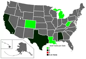 ![]() Number of bowl games per state | |||||||||||||||||||||||||||||||||||||||||||||