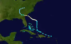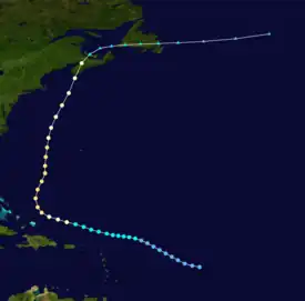 A tropical depression was first detected east of the Lesser Antilles on September 7,[3] though at the time weather observations in the area were sparse.[2][6] The disturbance gradually intensified throughout much of its early formative stages, attaining tropical storm strength on September 10; further strengthening into a hurricane north of Puerto Rico occurred two days later. Shortly thereafter, the hurricane recurved northward, and reached peak intensity the following day as a modern-day Category 2 hurricane with maximum sustained winds of 100 mph (160 km/h) and a minimum barometric pressure of at least 988 mbar (988 hPa; 29.2 inHg).[2][6] The cyclone steadily weakened thereafter before making landfall on Nova Scotia on September 17 with winds of 85 mph (137 km/h).[20] Moving into the Gulf of Saint Lawrence later that day, the storm transitioned into an extratropical cyclone. The remnant system curved eastward and passed over Newfoundland before dissipating over the Atlantic on September 19.[3]