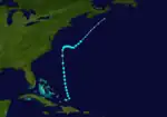 On August 26, a low-pressure area in the open Atlantic Ocean became sufficiently organized to be classified as a tropical cyclone. Moving slowly in a general west-northwest motion, the disturbance intensified, reaching tropical storm strength on August 28 and subsequently hurricane intensity on August 30.[3] The hurricane passed within 85 mi (137 km) of Cape Hatteras before recurving towards the northeast.[6] However, the hurricane continued to intensify, and reached peak intensity as a modern-day Category 2 hurricane with maximum sustained winds of 110 mph (180 km/h) and a minimum barometric pressure of 961 mbar (961 hPa; 28.4 inHg), though these statistical peaks were achieved at different times on September 2. Afterwards, the tropical cyclone began a weakening trend as it proceeded northward, and had degenerated into a tropical storm by the time it made its first landfall on Nova Scotia later that day.[3] The storm transitioned into an extratropical cyclone the next day while making another landfall on New Brunswick. The extratropical remnants persisted into Quebec before merging with a larger extratropical system late on September 3.[2][6]