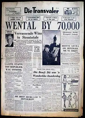 Front page of Die Transvaler, 7 October 1960, announcing republican victory by 70,000 votes