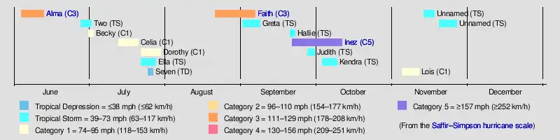 Four tropical cyclones developed in September, including tropical storms Greta, Hallie and Judith, as well as Hurricane Inez. Peaking as a Category 5 hurricane on the Saffir–Simpson hurricane wind scale with winds of 165 mph (270 km/h), Inez was the strongest tropical cyclone of the season. Although Inez persisted into October, no other system developed that month.[6] Two named storms usually form in October.[9] The final tropical cyclone, Hurricane Lois, existed from November 4 to November 11.[6]
