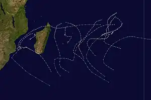 Cyclone Georgette was the longest-lasting tropical cyclone in the South-West Indian Ocean basin since the advent of satellite imagery.[2] It formed on January 10, 1968, well to the northeast of the Mascarene Islands. Tracking generally westward, Georgette struck northern Madagascar on January 15 as a tropical storm. It moved southwestward in the Mozambique Channel, crossing over eastern Mozambique on January 19. It quickly reached open waters while gradually intensifying, executing a loop off of eastern Mozambique. Georgette continued to the southeast, passing over southern Madagascar on January 28.[3] It was last noted on February 2 after lasting for 24 days.[2]