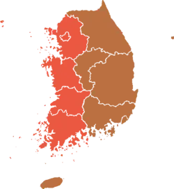 Chungnam | 489,516 | (45.4%) | 505,076 | (46.8%) | 17,662 | (1.6%) | 27,295 | (2.5%) | 28,809 | (2.7%) | 10,560 | (1.0%) | 1,078,918 | ![]() |