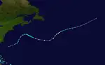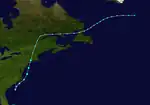 An upper-level trough and attendant frontal boundary moved into the western Atlantic on September 8. The next day, an area of low pressure formed on the tail-end of this front and began to organize as it moved westward. Surface observations suggested the formation of a tropical depression by 00:00 UTC on September 10. The newly formed system curved north-northeast in advance of another trough and intensified into a tropical storm while passing offshore the Carolinas. On September 11, it attained peak winds of 65 mph (100 km/h), a strength it maintained while making landfall in Long Island, New York, around 10:00 UTC that day. A few hours later, the storm transitioned into an extratropical cyclone as it became intertwined with a front. It crossed Newfoundland into the North Atlantic, interacting with another non-tropical low before dissipating on September 17.[17]