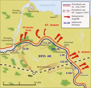 In August the 196th was transferred to 67th Army, somewhat to the east, but still in Leningrad Front.[40] The Army was located in the western half of the land corridor to the city that had been opened during Operation Iskra in January. On July 22 the 67th and 55th Armies, plus the 8th Army of Volkhov Front, had begun the Fifth Sinyavino Offensive in a renewed effort to take that place as well as Mga. The fighting continued until August 22, although the two sides had come to a standstill by August 4, with the Sinyavino Heights still in German hands and Mga still well in the rear.[41]