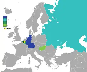 The hosts were only announced after the qualifying round, which meant all teams had to participate in the qualification process for the final stage.[1] Belgium was chosen among three candidates; the other bids came from England and Italy,[2] whose teams did not reach the semi-finals.