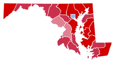 Maryland was won by incumbent President Richard Nixon of California and Vice President Spiro Agnew (a Maryland native), winning 61.26% of the vote to George McGovern and Shriver's 37.36%. Nixon won every county in the state, only losing independent Baltimore City. He won over 77% of the vote in Carroll County, and over 70% in another eight counties. This is the last time Prince George's County has voted Republican in a presidential election,[1] and the last of only 7 occasions[lower-alpha 1] since the emergence of the Republican Party that Maryland has voted more Republican than the nation as a whole.[2] As of 2020, this remains the strongest performance by a Republican in Maryland, and the last time the Democratic candidate was held to under 60% of the vote in Baltimore City.[3]