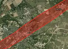 The tornado formed near Bellbrook, Ohio, southwest of Xenia, at about 4:30 pm EDT. It began as a moderate-sized tornado, later intensifying after moving northeast at about 50 mph (80 km/h). The tornado exhibited a multiple-vortex structure, which was described as a "pair of funnels coming together",[5] and became very large as it approached town. Gil Whitney, the weather specialist for WHIO-TV in Dayton, alerted viewers in Montgomery and Greene Counties (where Xenia is located) about the possible tornado, broadcasting the radar image of the supercell with a pronounced hook echo on the rear flank of the storm several minutes before it struck. The storm was visible on radar because of raindrops wrapping around the circulation.[6] The massive tornado went into the western part of Xenia, completely flattening the Windsor Park and Arrowhead subdivisions at an intensity of F5 and sweeping away entire rows of brick homes with little debris left behind. Extensive wind-rowing of debris occurred in nearby fields.[7]