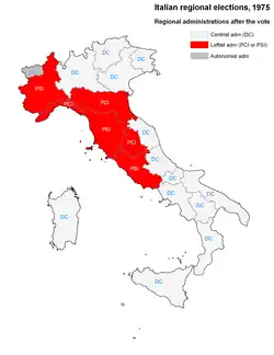 Nine Regional Councils elected administrations led by a Christian Democracy members backed by centrist alliances, while three regions, Piedmont, Liguria and Latium, changed sides, adding themselves to the traditional leftist strongholds Emilia-Romagna, Tuscany and Umbria: PCI and PSI shared three presidencies each. It was a big victory for Communist leader Enrico Berlinguer.
