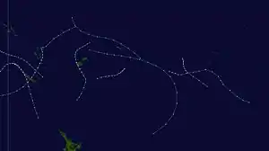 Cliff developed on February 9, near Vanua Lava, Vanuatu. The cyclone reached peak intensity on February 12, with an estimated central pressure of 975 hPa. It passed over New Caledonia at near peak intensity, with sustained winds 92 km/h (57 mph). After crossing into the Australian region, Cliff struck Queensland on February 14, making landfall near Bundaberg. The cyclone caused some crop and structural damages in South East Queensland, and beach erosion occurred on the Gold and Sunshine coasts. One man was drowned off the Gold Coast.[2]