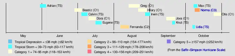 The strongest tropical cyclone of the season was Hurricane Norma, which was a powerful Category 3 hurricane on the Saffir–Simpson Hurricane Scale. The storm caused six deaths – five in Texas, and one in Mexico, due to severe flooding. Additionally, the storm caused $74 million (equivalent to $238.2 million in 2022) in damage, which is credited to significant crop damage and many tornadoes. However, the deadliest tropical cyclone of the season was Tropical Storm Lidia, which made two landfalls – one on the southern tip of the Baja California Peninsula and the other along the shores of Sinaloa in early October. As the result of its heavy rainfall in northwestern Mexico, seventy-three fatalities were reported, along with $80 million in damage.