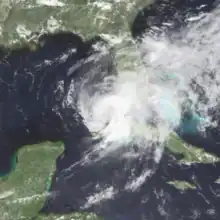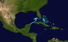 On June 1, a tropical depression formed off western Cuba from an organized cloud system. It moved slowly northeastward through the Gulf of Mexico, and strengthened into Tropical Storm Alberto on June 3. Alberto traveled generally northeast on an erratic course, and briefly intensified to a Category 1 hurricane, one of the earliest hurricanes of June, and the earliest date for a hurricane in the Atlantic Ocean since Hurricane Alma in May 1970.[7] Due to strengthening vertical wind shear, Alberto then quickly weakened into a tropical storm, doubled back to the west, and dissipated near the Florida Keys on June 6. Alberto is an example of a storm to enter the Gulf of Mexico and dissipating while never making landfall, which is an unusual event.[7]