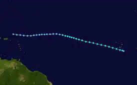 This tropical depression formed 900 miles (1,400 km) west of the Cape Verde Islands on September 16,[27] and moved west-northwest across the tropical Atlantic Ocean.[28] The system moved within 750 miles (1,210 km) east of the Leeward Islands before dissipating on September 20.[29]
