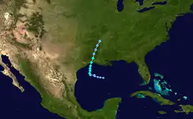 A surface low-pressure area developed on September 8 in the Gulf of Mexico. It drifted westward, and the next day it organized into a subtropical depression. Under the influence of a trough of low pressure, the depression turned northward, and after steadily becoming better organized it transitioned into Tropical Storm Chris by late on September 10. The storm attained peak winds of 65 mph (105 km/h) before moving ashore near Sabine Pass in Texas. Chris continued inland until it dissipated over central Arkansas on September 13. Prior to making landfall, as many as 6,500 people evacuated from southern Louisiana, while offshore many oil workers were evacuated inland.[18]