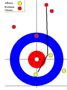 Hackner found himself in a two-point deficit coming into the tenth end, and he was forced to make a very tough double takeout and stick his shooter in order to tie the game. The shot allowed him to steal a point in the extra end when Ryan was heavy with his last stone.[4]