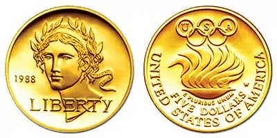 The 1988 Olympic Commemorative Coin Act (Pub. L. 100–141) authorized the production of two coins, a silver dollar and a gold half eagle. Congress authorized the coins to support the training of American athletes participating in the 1988 Olympic Games. The act allowed the coins to be struck in both proof and uncirculated finishes.[1]