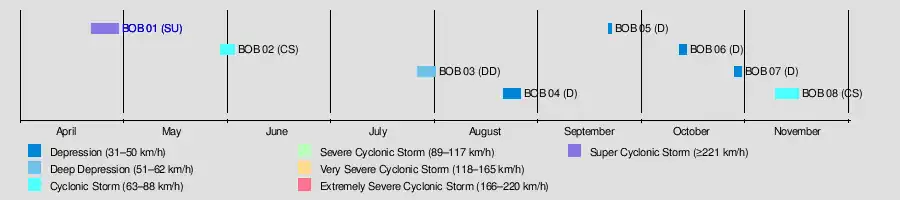 BOB 01 | April 22–30 | Super Cyclonic Storm | 240 km/h (150 mph) | 920 hPa (27.17 inHg) | India, Bangladesh, Myanmar, Yunnan | $1.5 billion | 138,866 | |