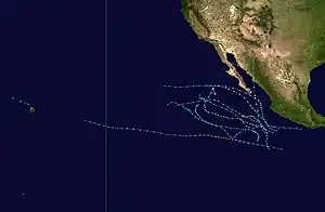 - 1 2 3 4 National Hurricane Center; Hurricane Research Division; Central Pacific Hurricane Center (April 4, 2023). "The Northeast and North Central Pacific hurricane database 1949–2022". United States National Oceanic and Atmospheric Administration's National Weather Service. A guide on how to read the database is available here.