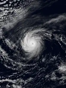 On July 18, contrary to the predictions, Cosme became much better organized, and well-defined banding features were visible on satellite imagery.[23] The storm continued to steadily intensify, and subsequent to the development of an eye, Cosme strengthened into a hurricane late on July 19, while located 380 miles (610 km) west-southwest of the southern tip of Baja California Peninsula.[24] After maintaining hurricane status for 18 hours, Cosme weakened back to a tropical storm on July 20.[20] Cooler water temperatures deteriorated the convection near the center, resulting in Cosme quickly weakening to a tropical depression on July 21.[25] After turning to the west-southwest, Cosme dissipated on July 22. Cosme never affected land, and as a result caused no damage or fatalities. However, the intensity of the storm is still uncertain; late on July 18, a ship 70 mi (110 km) to the east of Cosme reported winds of 17 mph (27 km/h), despite that a normal 50 mph (80 km/h) tropical storm would produce tropical storm force winds for locations within at least 70 mi (110 km) of the center.[20]