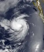 On August 22, the cloud pattern of Gil became better organized, though the low-level circulation was located to the northeast of the deep convection due to the wind shear.[38] The shear also limited outflow to the east, preventing further strengthening. Gradually the convection developed nearer to the center.[39] After Gil turned to the northwest, the deep convection organized into a central dense overcast, and it strengthened to reach winds of 60 mph (97 km/h) on August 24.[40] Later that day the storm attained a peak strength of 65 mph (105 km/h) while located 380 mi (610 km) southwest of the southern tip of Baja California Peninsula. After maintaining its peak strength for 30 hours, Gil moved over progressively cooler waters, and weakened to a tropical depression on August 26. The depression drifted westward and later turned to the north, and dissipated on August 27 while located 670 mi (1,080 km) to the west of Cabo San Lucas.[34] While located a short distance off of Mexico, Gil produced heavy rainfall near the coast.[36] However, there were no reports of casualties or damages in association with the storm.[34]