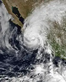 A tropical wave moved off the coast of Africa on August 15. It traversed westward and entered the eastern Pacific Ocean on August 29. The system quickly developed deep convection and a low-level circulation, and on September 1 it organized into Tropical Depression Nine-E while located about 170 mi (270 km) off the southwest coast of Mexico. Under favorable conditions, the depression slowly strengthened to become Tropical Storm Henriette on September 2 while located 220 mi (350 km) west of Manzanillo.[41] Henriette quickly organized and intensified into a hurricane on September 3 while located 135 mi (217 km) west-southwest of Puerto Vallarta in Jalisco.[41] Late on September 3, an eye began to form in the center of the deep convection as Henriette turned to the northwest.[42] The eye became better defined the next day, and Henriette attained a peak intensity of 100 mph (160 km/h) as the northern portion of the eyewall moved over southern Baja California Peninsula. The hurricane quickly crossed the southern tip of Baja California Peninsula and re-emerged into the Pacific Ocean.[43] Convection gradually waned as the hurricane moved over progressively colder waters,[44] and on September 6 Henriette weakened to a tropical depression.[41]