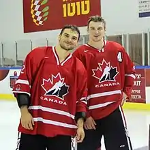Canadian National Hockey League player Zach Hyman had three goals and three assists in two games, and won a gold medal, and was joined on the team by Adam Henrich, Andrew Calof, and Olivier Dame-Malka.[24][25][26] Canadian Olympic volleyball players Josh Binstock and Sam Schachter competed for Canada winning a silver medal in indoor volleyball, and Binstock was Canada's flag-bearer.[27][28][29]