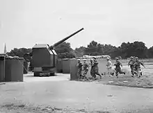 On 5 June 1940, after the British Army had been evacuated from Dunkirk and the Battle of Britain was about to start, the 1st AA Division comprised 45 4.5-inch, 39 3.7-inch and 26 3-inch HAA guns, with three 3-inch, 19 Bofors, three twin Vickers and 185 LMGs in the LAA role, together with 240 90 cm searchlights.[19] On 11 July, the division's guns were disposed with 92 defending London, 28 at Slough, 4 at Hounslow, 4 at Stanmore, and 34 others dispersed to VPs.[20]