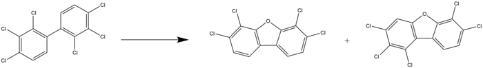 PCBs can be used to synthesise polychlorinated dibenzofurans, including tetrachlorinated dibenzofurans (TCDF) and pentachlorinated dibenzofurans (PenCDF). These compounds share a similar structure with polychlorinated dibenzo-p-dioxins. In particular, 2,2’,3,3’,4,4’-hexachlorodiphenyl is used to synthesise TCDF-3467 and PenCDF-12367. The synthesis is conducted with oxygen between 550 – 600 °C for 5s.[9]