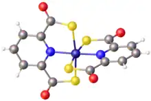 Structure of Fe(III) complex with two 2,6-pyridinedicarbothioate ligands.[6] Color code: yellow = S, blue = N and Fe, gray = C, red = O.