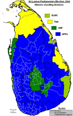 ![]() Winners of polling divisions. UPFA in blue and UNF in green. | ||||||||||||||||||||||||||||||||||